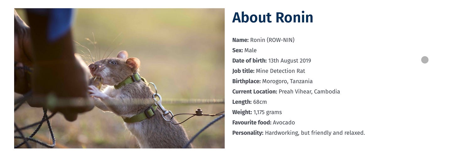 Thank u Ronin. I’ve had a lot of difficulty navigating a growing wave of hopelessness and despair over the past few months. This poem was inspired by Dr. Jane Goodall, who taught us so much about animals and from whom I first learned about APOPO & the HeroRats. When I heard of her death last week I remembered Ronin, and I remembered how many people (and rodents) are fighting every day, each in their own small way, to make the world just a little better. Thank u Jane.