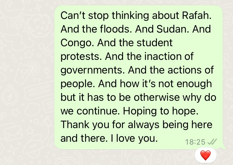 I talked to my sister on Sunday. She was delivering aid to her former university’s Palestine Solidarity encampment. We talked about all the sad things until the sadness became silence and she asked us to change topics. We changed topics and talked shit about our dad.